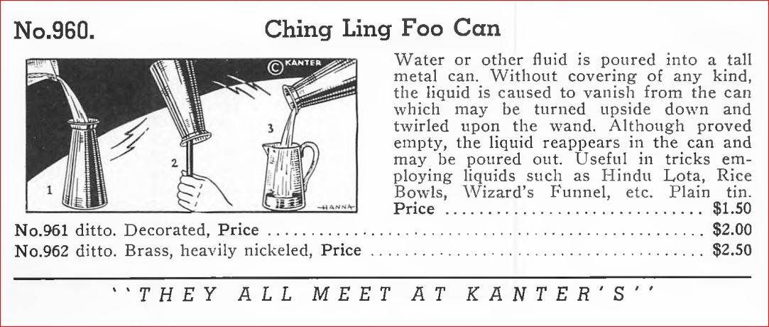 The Foo Can is one of magic’s oldest and most astonishing liquid effects, introduced by the legendary Chinese magician Ching Ling Foo in 1898. Originally known as the “Ching Ling Foo Can,” it later became widely known simply as the Foo Can or “Chinese Water Can.”
